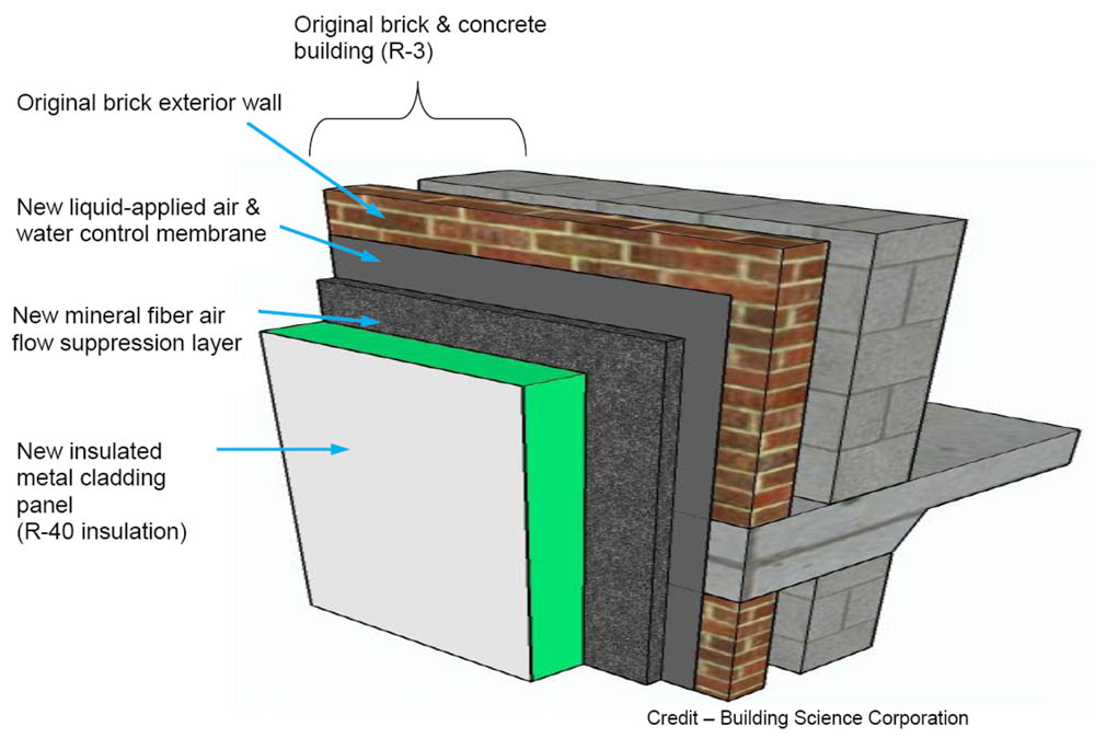 A product of urban renewal, this 1960s 192-unit seven story building had concrete walls with brick infill and no insulation (R-3 wall assembly), and the roofs had minimal insulation (R-20). Air leakage was extensive. Windows were poorly insulated aluminum sliders (R-1.7). Central atmospheric boilers (70 percent efficiency) provided heating and hot water. The pipes had no insulation. Apartments had inefficient through-the-wall air conditioners. Residents complained of poor air quality and of being cold in the winter and stifling in the summer.